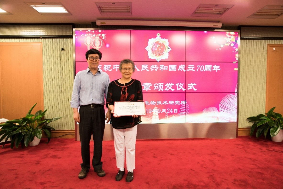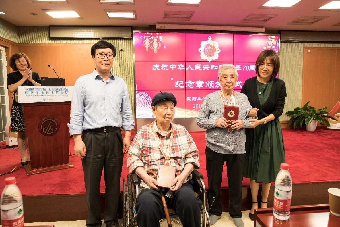 在中华人民共和国成立70周年之际,中共中央、国务院、中央军委向中华人民共和国成立前参加工作的、健在的老战士老同志,中华人民共和国成立后获得国家级表彰奖励及以上荣誉并健在的人员等,颁发“庆祝中华人民共和国成立70周年”纪念章。药生所戚天庆、李景华、刘贞静、于春珍、李克勤、刘幼敏、律恩钰、甄永苏、许鸿章、蒋建东、游雪甫、宋丹青共12名同志获此殊荣。