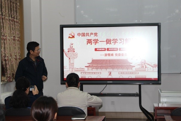 10月27日,党委委员游雪甫教授在药理支部和病毒-免疫支部,从“两学一做”的背景介绍、总体要求、主要内容、主要措施、习近平论·如何做一名合格共产党员和从我做起·做一名合格共产党员六个方面进行了 “两学一做”学习解读。
