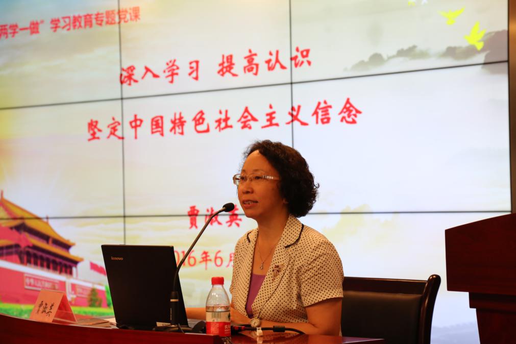 贾书记首先阐述了“两学一做”学习教育的目的、内容和要求。她从学习《党章》规定和习近平总书记关于中国特色社会主义相关论述出发,阐述了中国特色社会主义的内涵、本质特征、基本内容和领导核心,通过回顾世界科学社会主义理论和道路500年探索历史和中华民族170年来革命与建设探索与发展历史,通过中外社会发展模式和国家结构形式与根本政治制度等理论体系梳理与现实实践的优劣比较,明确坚持中国共产党领导、坚定中国特色社会主义信念的正确性和历史必然性,明确共产主义远大理想的理论与现实基础,强调社会主义核心价值观作为中国特色社会主义重要组成部分,对于纯洁和先进党员干部内在思想动机引领的重要性和必要性。最后以“坚定理想信念,做合格共产党员”为题,对党员干部提出要求。