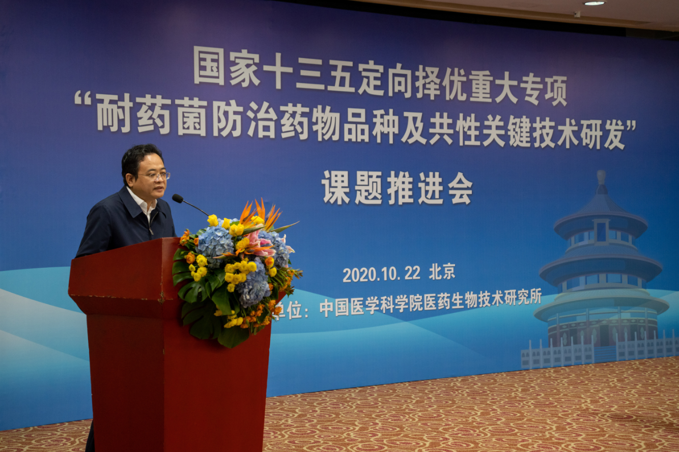 On October 22nd, 2020, the promotion meeting of “Research and Development of Drug Varieties and Common Key Technologies for the Control of Drug-resistant Bacteria” supported by National Science and Technology Major Project during the “13th Five-Year Plan” which was led by Professor Xuefu You from the Institute of Medical Biotechnology, CAMS&PUMC was held in Beijing. Mr. Jinhui Gu, Deputy Director-General of Department of Health Science, Technology and Education, National Health Commission, Mr. Zhongwei Zheng, Director of Development Center for Medical Science & Technology, Mr. Li Yan, Director of Division, Development Center for Medical Science & Technology, Prof. Jianwei Wang, Vice-president of CAMS&PUMC, Prof. Jiandong Jiang, Dean of School of Pharmaceutical Sciences, Prof. Lei Wu, Prof. Yongcheng Che, Prof. Zhuorong Li, Prof. Xuefu You who is the project leader and more than 100 staff members attended the meeting. Prof. Zhuorong Li presided at it. Mr. Jinhui Gu and Mr. Zhongwei Zheng have addressed.