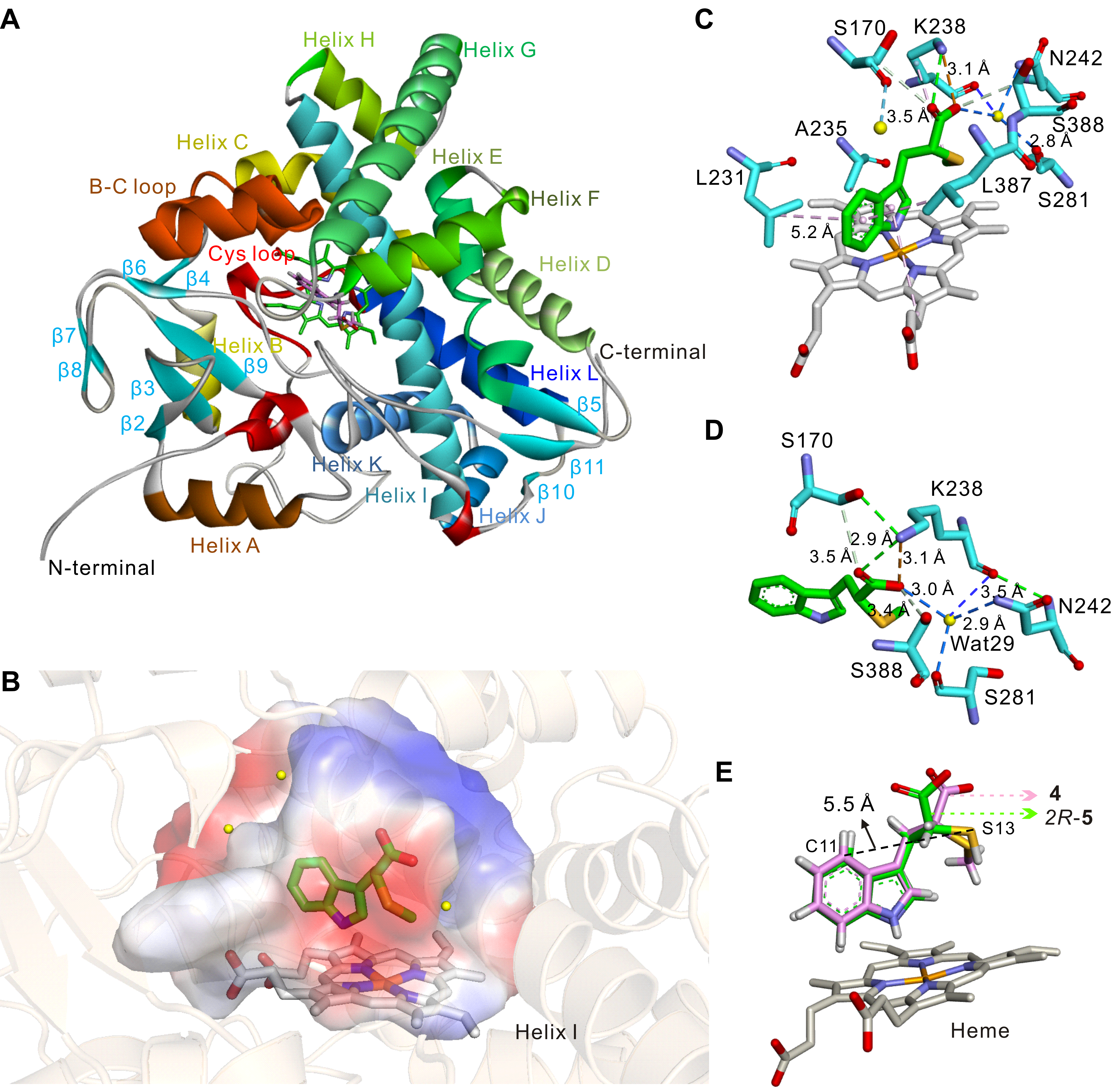 To further understand the structural basis of CxnD catalyzing the intra-molecular C-S bond formation, they solved CxnD (CxnD with a C28S replacement) crystal structure. Specifically, CxnD/C28S apoprotein and its complexes with 2, 3, or 4 were tried for crystallization. Fortunately, a high-quality CxnD/C28S with 4 needle crystal was obtained. The CxnD/C28S crystal structure was resolved at resolution 2.0 Å (PDB ID 6KFW). A molecular docking of 2R -5 into CxnD/C28S by AutoDock Vina was conducted to predict the binding mode of the authentic substrate. The active site cavity and binding mode of 2R -5 is similar to that of 4 in CxnD, and interactions between 2R -5 and CxnD to hold the substrate at its orientation and position in the active site cavity were revealed.