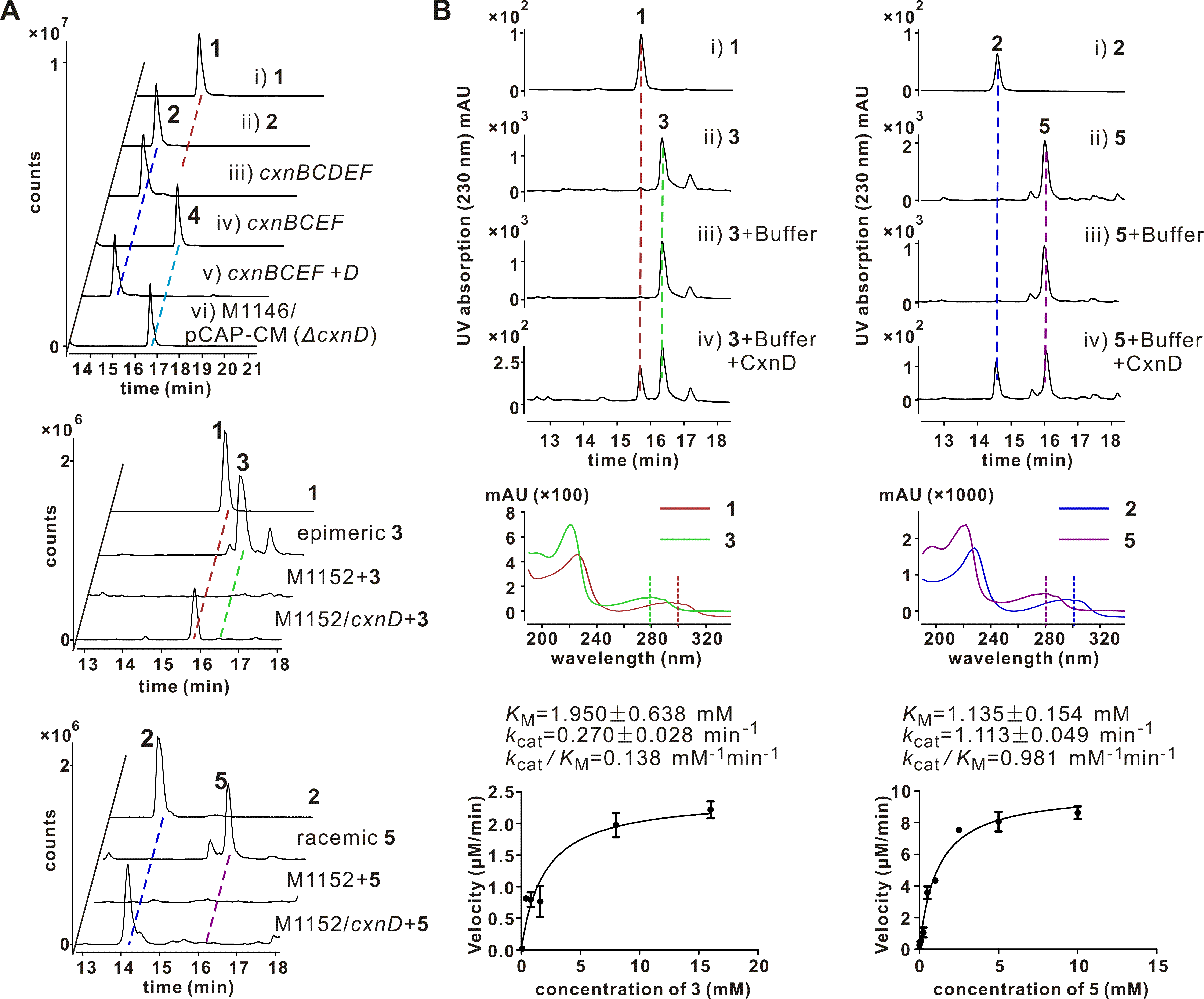 Chuangxinmycin, discovered in the 1970s by scientists from Institute of Antibiotics (now Institute of Medicinal Biotechnology), Chinese Academy of Medical Sciences, is a secondary metabolite containing an indole-dihydrothiopyran heterocyclic skeleton isolated from Actinoplanes tsinanensis CPCC 200056. Its biosynthetic gene cluster was located and cloned in 2017 by Hong’s and Wu’s labs ( Acta Pharm Sin B , 2017). And based on the product of cxnD -disruption mutant, an intra-molecular C-S bond formation by the cytochrome P450 CxnD was proposed to generate the tricyclic dihydrothiopyrano[4,3,2- cd ]indole skeleton. In the present research, they constructed the recombinant S. coelicolor M1152 which contained an incomplete cxn cluster without CxnD and methylation system CxnA and Ats4177 (i.e., CxnBCEF), isolated and identified the intermediate 4, suggesting that the compound 5 is the authentic substrate for CxnD catalysis in chuangxinmycin biosynthesis. Through in vivo feeding and in vitro enzyme assays, they demonstrated that CxnD can catalyze intra-molecular C( sp2 )-H thiolation of 3 and 5 to generate 1 and 2, respectively. Besides, 2R -5 was determined as the optimal substrate for CxnD.