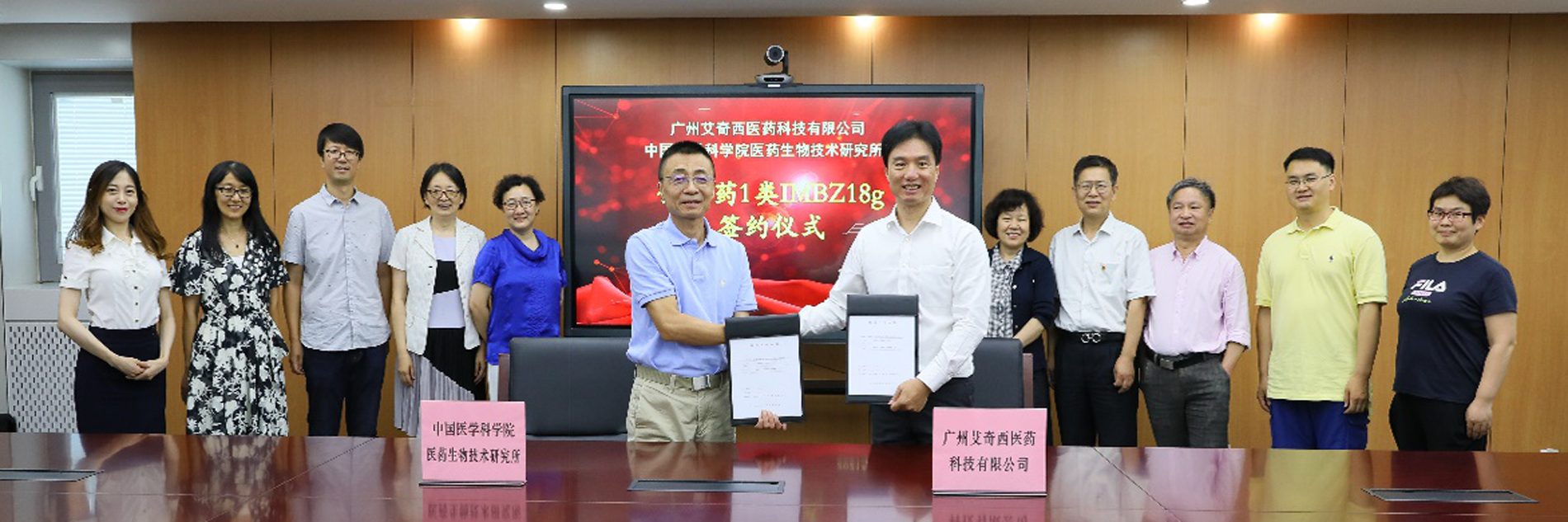 On July 6, 2021, the Institute of Medicinal Biotechnology (IMB), Chinese Academy of Medical Sciences and Guangzhou aiqixi Pharmaceutical Technology Co., Ltd. (Aiqixi) officially signed a cooperative R&D agreement on class 1 chemical drug IMBZ18g. Professor Yongsheng Che (vice director), Professor Zhuorong Li (vice director), Fengnian Sheng (director of Academic Research Office), Professor Danqing Song and Xuefu You (project leaders) from IMB and Lidong Lin (chairman) and Shengxi Feng (general manager) from Aiqixi attended the signing ceremony and held a friendly and warm discussion. The meeting was presided over by Professor Zhuorong Li.