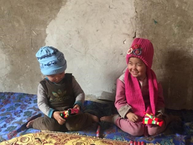 午饭后我们去了王亮老师和玛尔哈巴的亲戚家。王老师为他亲戚家的三个孩子每人准备了一套帽子、围巾、手套和袜子。当王老师亲自为衣服单薄、光着脚丫的二女儿戴上帽子和围巾的时候,小女孩那种喜悦和满足的表情让我心生酸楚,又激荡不已。