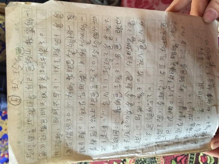 在买克苏老师亲戚家,我们看到二女儿苏比努尔·阿卜拉的作业本上用着很工整的字抄写着课文《玲玲的画》、《登鹳雀楼》和《望庐山瀑布》。
