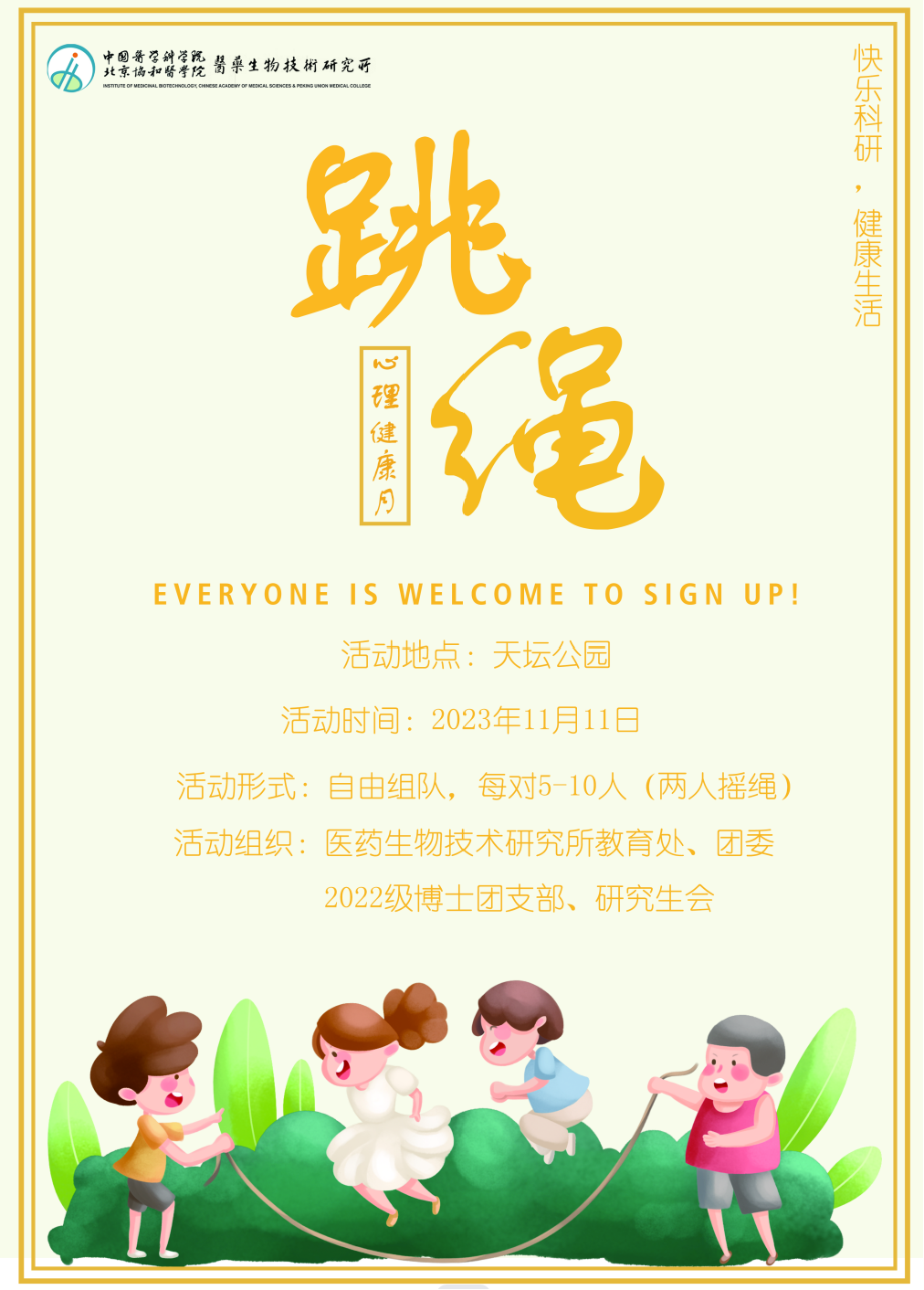 为丰富校园文化生活,加强研究生心理健康教育,帮助学生缓解压力、释放情绪,提高身体素质和心理素质,教育处、团委于11月11日在天坛公园组织研究生开展“‘绳’采飞扬 ,跳出精彩  ”心理健康活动。本次活动由2022级博士团支部和研究生会联合承办。