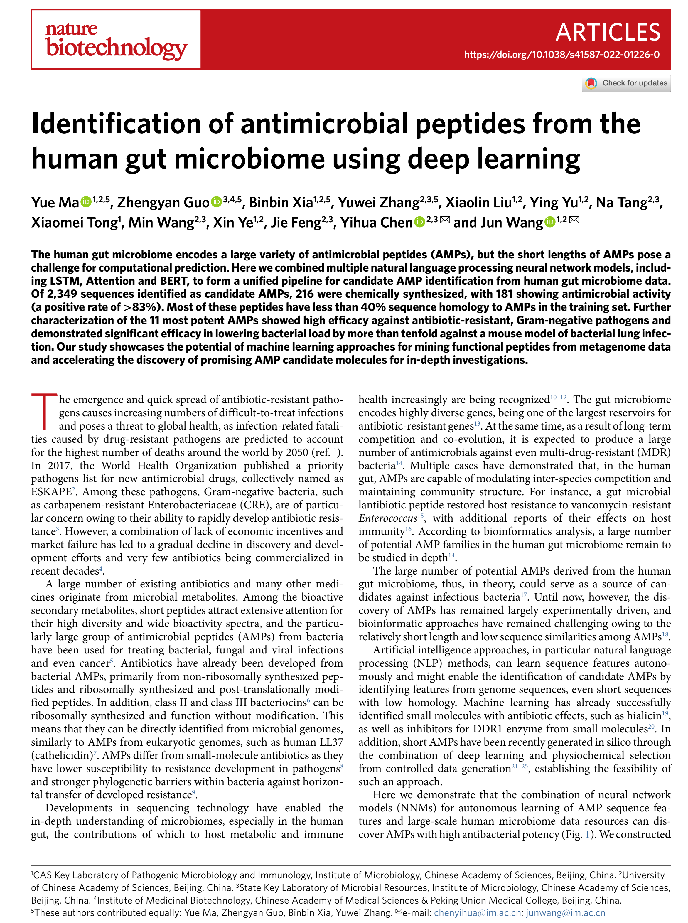 我所郭正彦研究员与合作团队中国科学院微生物研究所陈义华课题组和王军课题组在Nature Biotechnology上发表了研究论文“Identification of antimicrobial peptides from the human gut microbiome using deep learning”,介绍了他们最新研究成果。